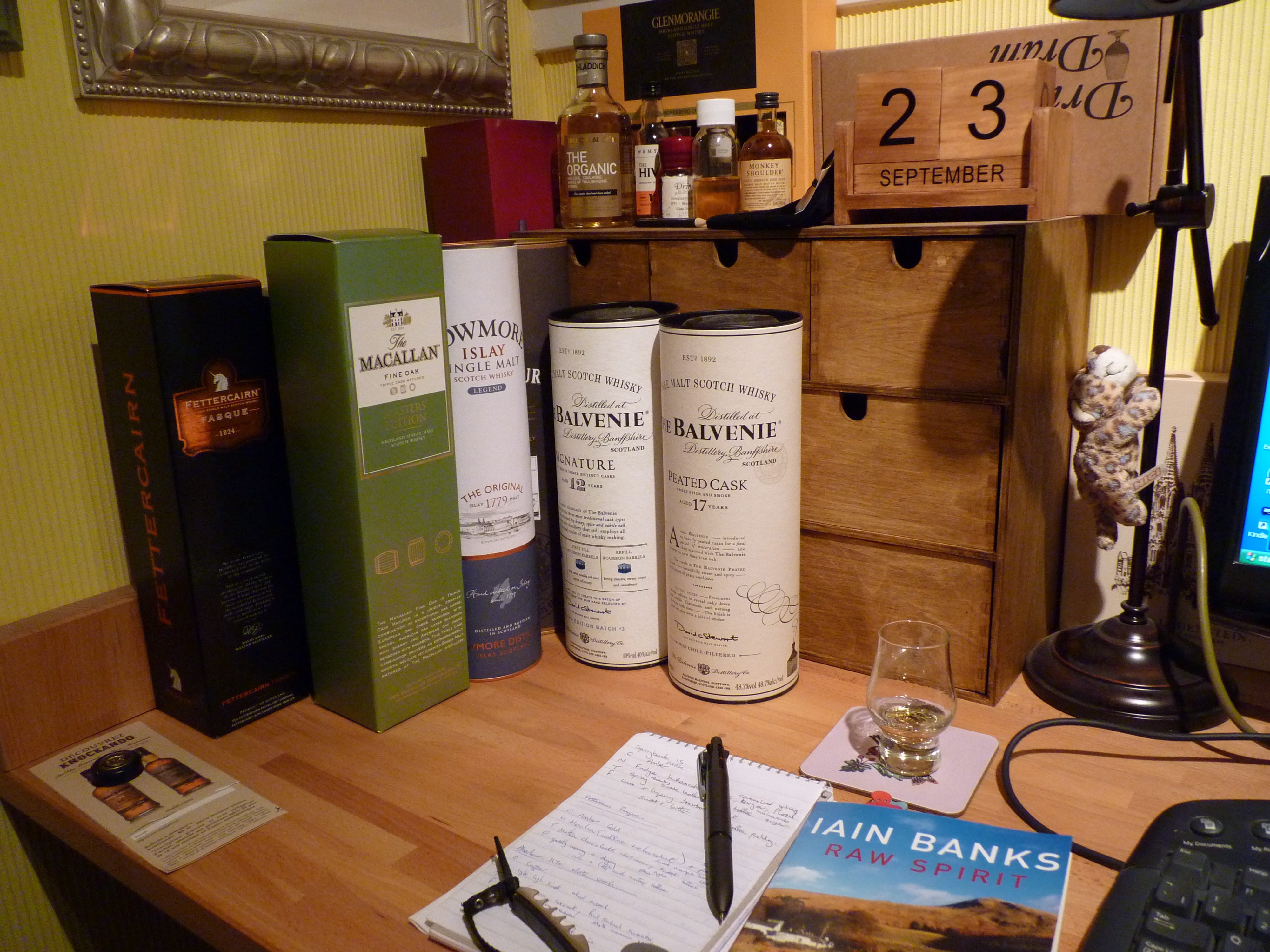 After the second swallow I think about the effects the whisky leaves in my mouth [called the Finish]. The finish can be long and lingering or over in an instant, drying or mouth watering, sweet or bitter, etc. I will then serially re-sip in an attempt to nail down exactly what the flavours were, or what they are most similar too in my recollection and experience. The great thing about tasting is everyone has a unique opinion or references to which they base their experience and so it is best done socially. The reason I started taking tasting notes was due to having tried so many whiskies I kept forgetting what each tasted like. Lastly I like to think about what food or occasion would compliment the whisky best [e.g. after dinner, or on a cold winter evening, etc.].