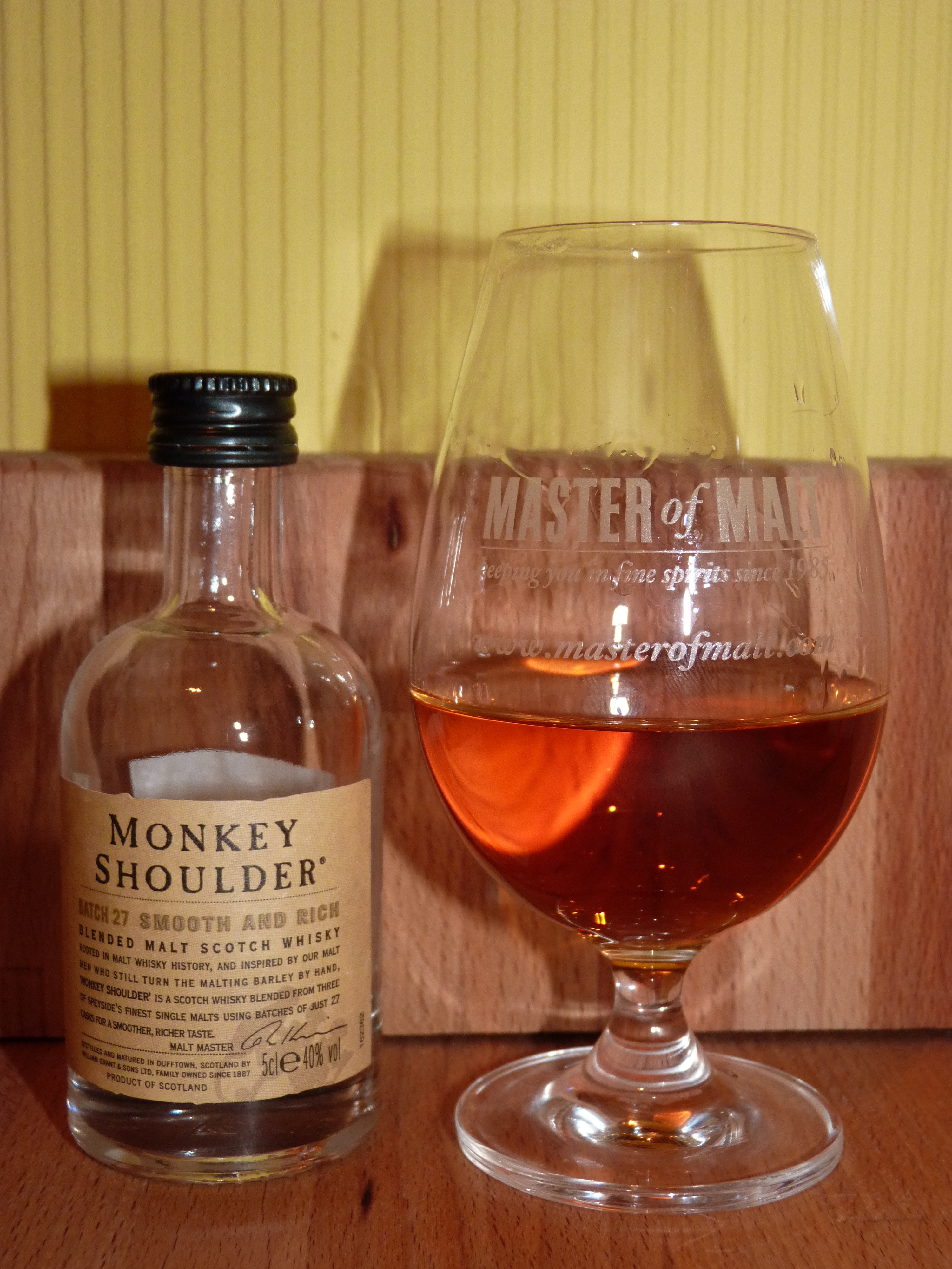 I purchased a 5cl miniature of the infamous Monkey Shoulder ‘triple malt’ from ASDA for £3 to see what this thoroughly modern blend was all about. This is from the brains at William Grant & Sons and is marketed as a hip new whisky for cocktail making and occasionally drinking as it comes. The blend is made from [likely] young spirit matured in bourbon oak casks from their Speyside distilleries; Glenfiddich, The Balvenie and Kininvie. The single malts are blended by one of the most experienced Malt Masters in the industry, David Stewart, and are likely vatted together for final maturation before bottling. The result is a highly drinkable but young tasting mixture that is not un-similar to a single malt.