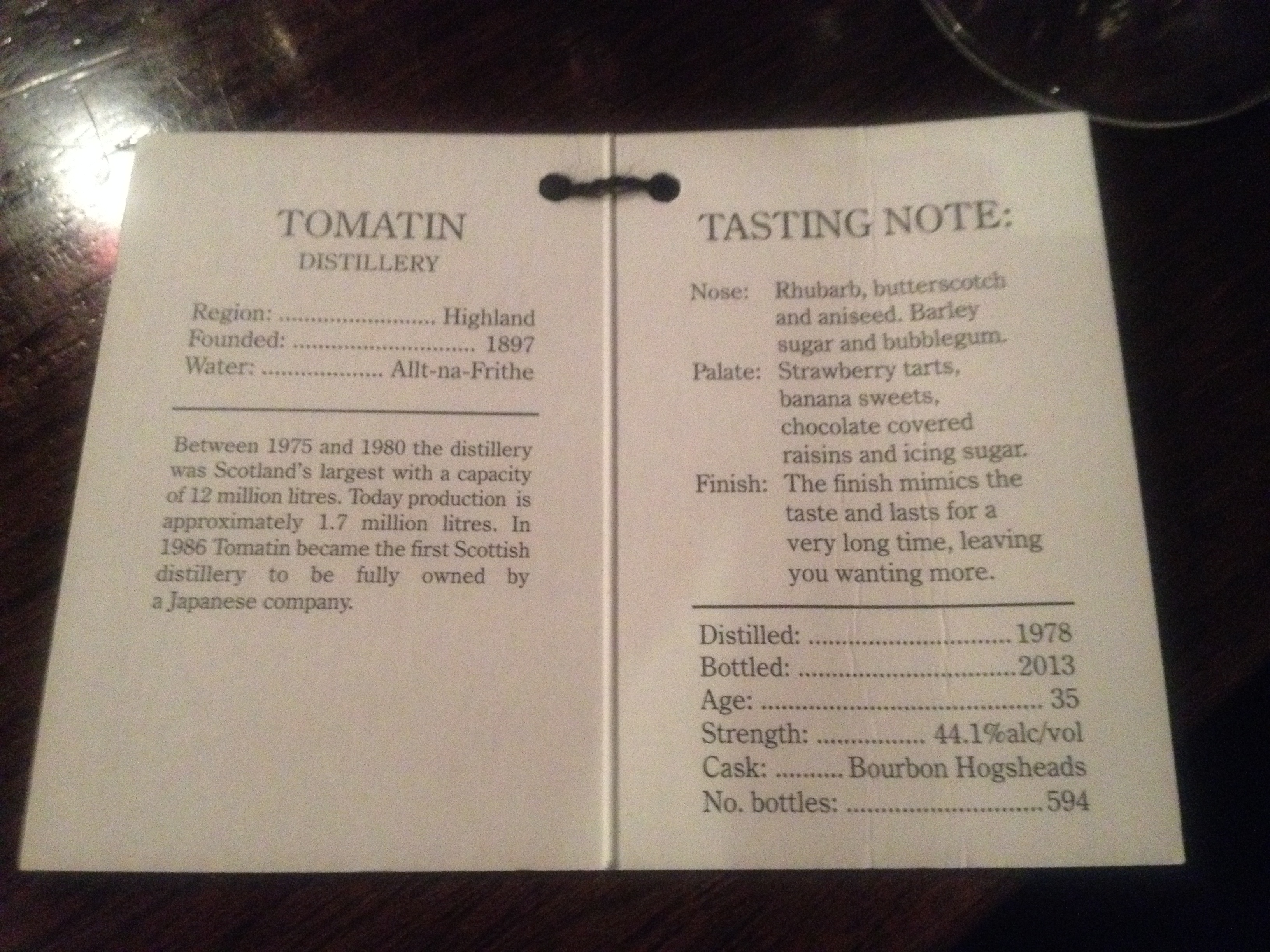Turns out this is the Tomatin 35 Years Old Cadenhead Small Batch, bottled at cask strength of 44.1% ABV, costing £160/bottle, Distilled in 1978, matured in bourbon hogsheads and bottled in 2013 for a 594 bottle outturn