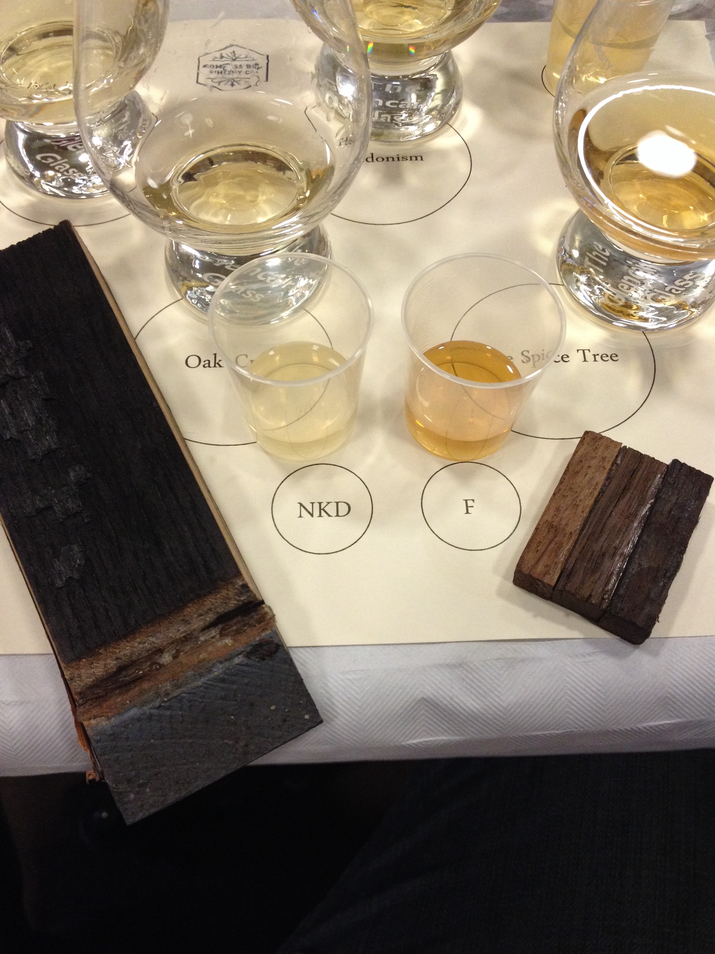 Oak Cross is from Compass Box’s range of 100% vatted single malt blends. These primarily consist of a mixture of 3 malts: ~60% Clynelish, ~20% Dailuaine and ~20% Teaninich, matured mostly in 1st fill and refill Bourbon casks (again ~9 to 11 years matured) this constitutes their “Naked” pure malt blend. This is then re-casked after belnding to marry in either old Bourbon casks or new Toasted French Oak casks and left for a further year to marry and further mature in their new casks before bottling. The French Oak casks are sourced from the Vosges forest region in France. In the following image you will see a sample of Naked blend next to the refill Bourbon cask stave on the left and a Toasted French Oak sample next to a pieces of French Oak displaying 3 different char levels of toasting – note the colour in the “F” French Oak matured blend.
