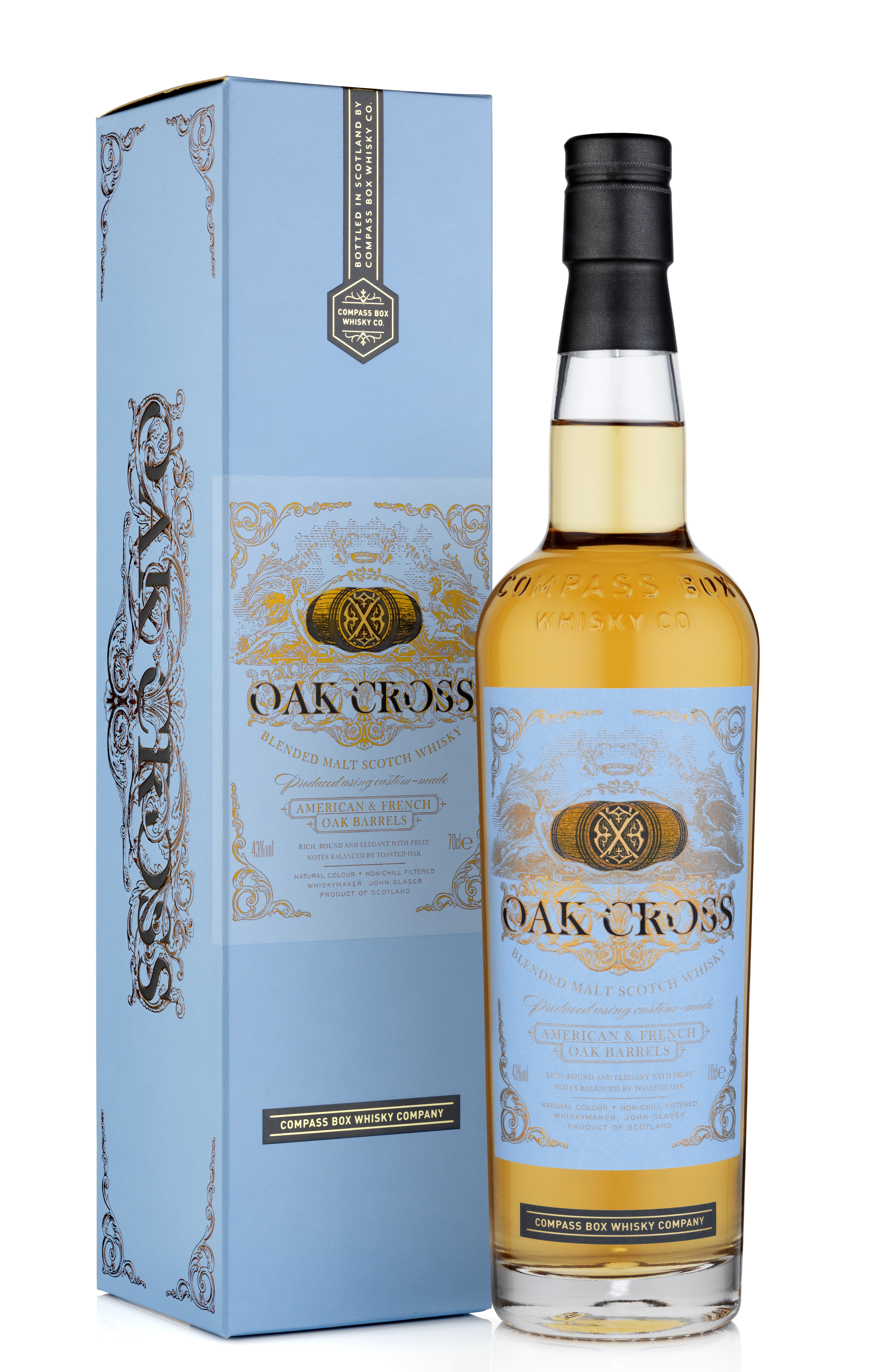 We call this whisky Oak Cross because it offers the best characteristics of both American and French oak aging. A rich, medium-bodied blended malt Scotch whisky, Oak Cross combines vanilla characters from American oak and spicy, clove-like characters from French oak.