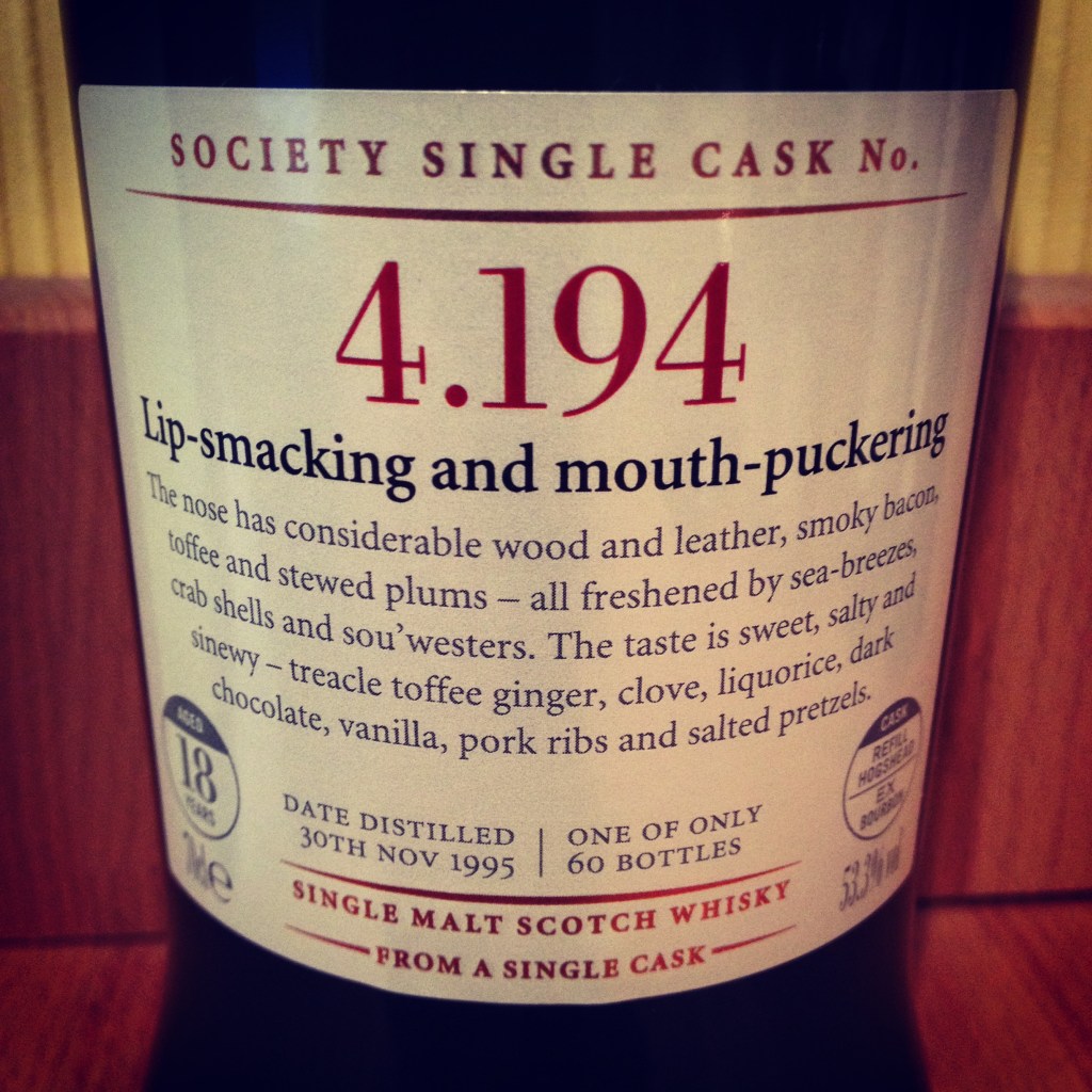 In November I was invited along to the pre-tasting of the Christmas releases at SMWS Queen Street, luckily for me the 2014 Christmas bottle releases from the Scotch Malt Whisky Society had some absolute corkers in it! One of these was this 18 year old expression from SMWS distillery #4, Highland Park. I have had a little love-hate relationship with Highland Park ever since I sampled their 12 year old. I was completely turned-on to Highland Park however when a chance encounter occurred between myself and a very sherried HP expression (called ~ A cigar and a leather armchair, or something similar) at the SMWS a few years ago – leading me to seek out the Highland Park Drakkar ~ 40% (Travel Retail Exclusive) expression as soon as it was released. Anyhow – the unusual story about this expression is it is from an ex-bourbon hogshead (250 litres at fill) yet only 60 bottles at 53.3% cask strength were yielded at the outurn. These data suggest either an extremely active cask or leakage somewhere amongst those 18 years? Either way as soon as I tasted this I knew I was buying a bottle!