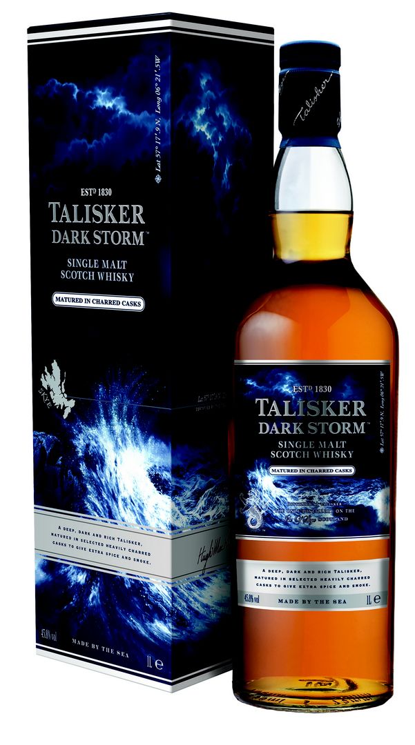 Talisker Dark Storm is a 45.8% single malt Scotch matured in heavily charred oak casks for flavours of blackcurrant, liquorice and powerful smoke.