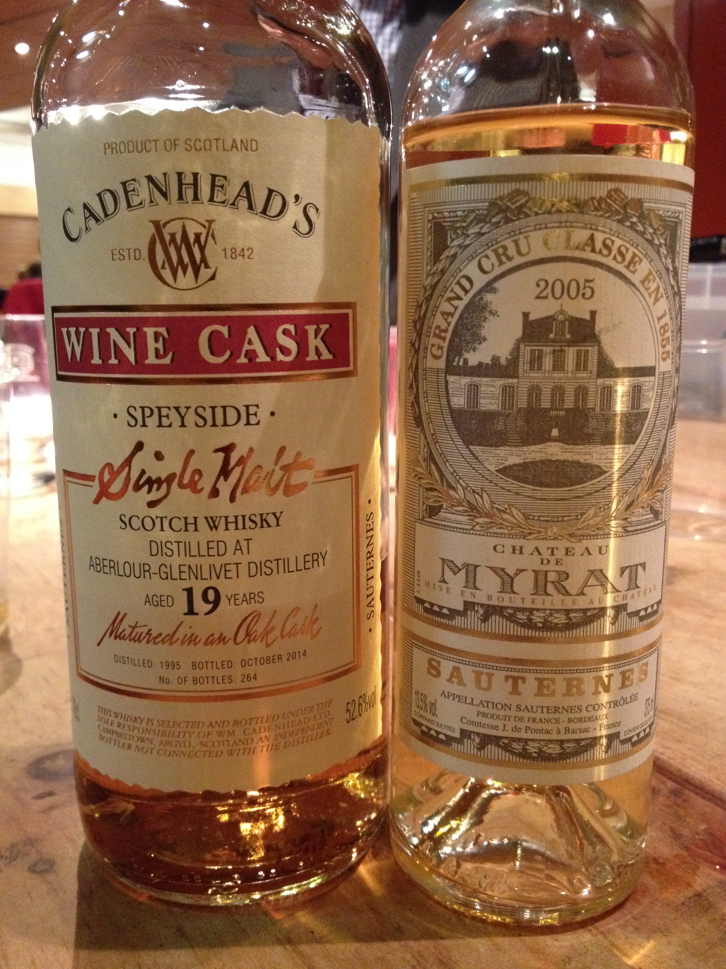 Dram #2 at the Water Of Life Society – The Giving Tree Tasting 05/03/2015 was this 19 Year Old Sauternes-matured Aberlour bottled by Wm Cadenhead’s as part of their Wine Cask range. Paired with the Château De Myrat Sauternes 2005.